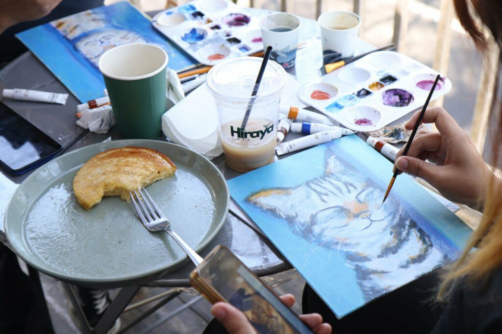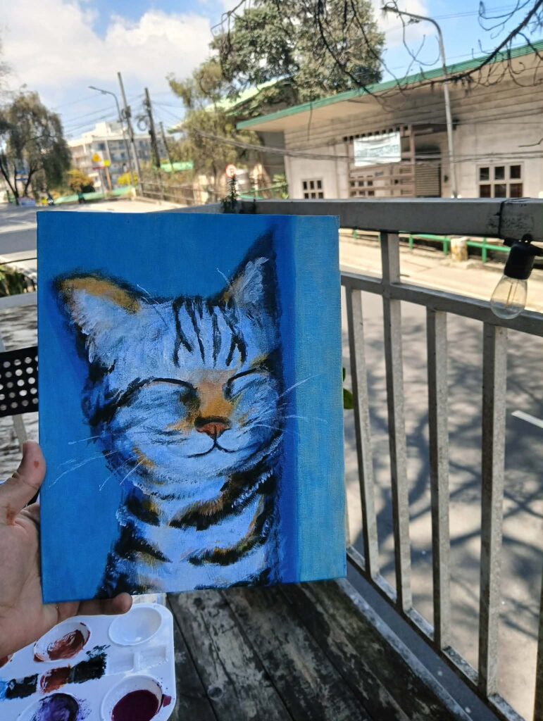After finishing the first layers of paint, we paused for the much-awaited part: brunch. You can’t work on an empty stomach, and after all, this is called the Brunch Club for a reason! We were free to choose from the available meals and drinks at Hiraya. I went for the breakfast plate, which included a sausage, two eggs, a few strips of bacon, and two fluffy pancakes drizzled with syrup, paired with an iced latte. We were seated at the veranda, where the sun shone brightly and a gentle breeze was blowing—exactly the kind of atmosphere I love. The sunlight and the wind also helped dry the background layers of our paintings quickly. I took my time finishing my plate while painting.